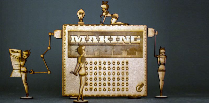 The influence of those two different worlds reflects in her themes and characters. Antique book stores, old-fashioned museums and flea markets are where she finds inspiration and materials for her artworks.