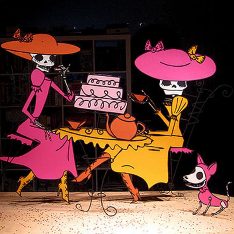The influence of those two different worlds reflects in her themes and characters. Antique book stores, old-fashioned museums and flea markets are where she finds inspiration and materials for her artworks.