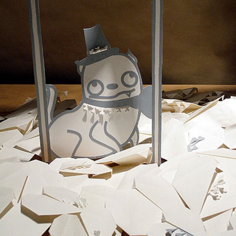She creates intricate hand-crafted designs including costumes for fashion displays and set-design as well as objects and paper taxidermy for private collectors.